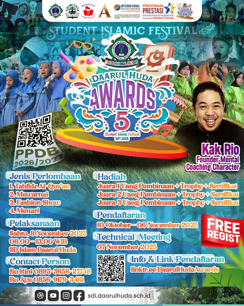 Ajang Bergengsi untuk Menyalurkan Bakat dan Prestasi Anak-anak Hebat! Assalamu’alaikum Warahmatullahi Wabarakatuh. Kabar gembira datang dari SD Islam Daarul Huda! Tahun ini, DAARUL HUDA AWARDS kembali hadir untuk kelima kalinya dengan tema besar “Student Islamic Festival (SIFT) 2025”. Acara ini menjadi wadah bagi para siswa-siswi TK/RA/PAUD se-Kota Tangerang dan sekitarnya untuk menyalurkan bakat, berkreasi, dan […]